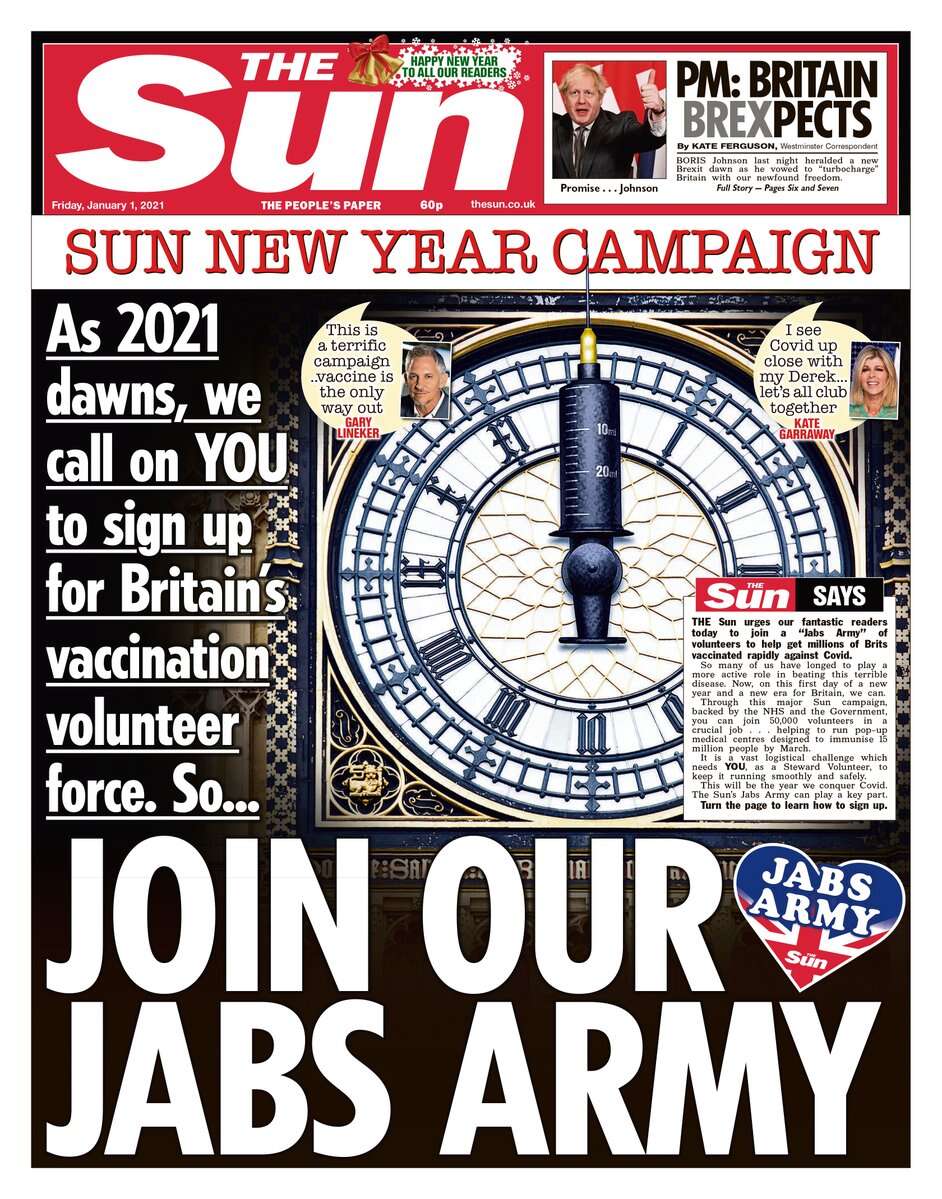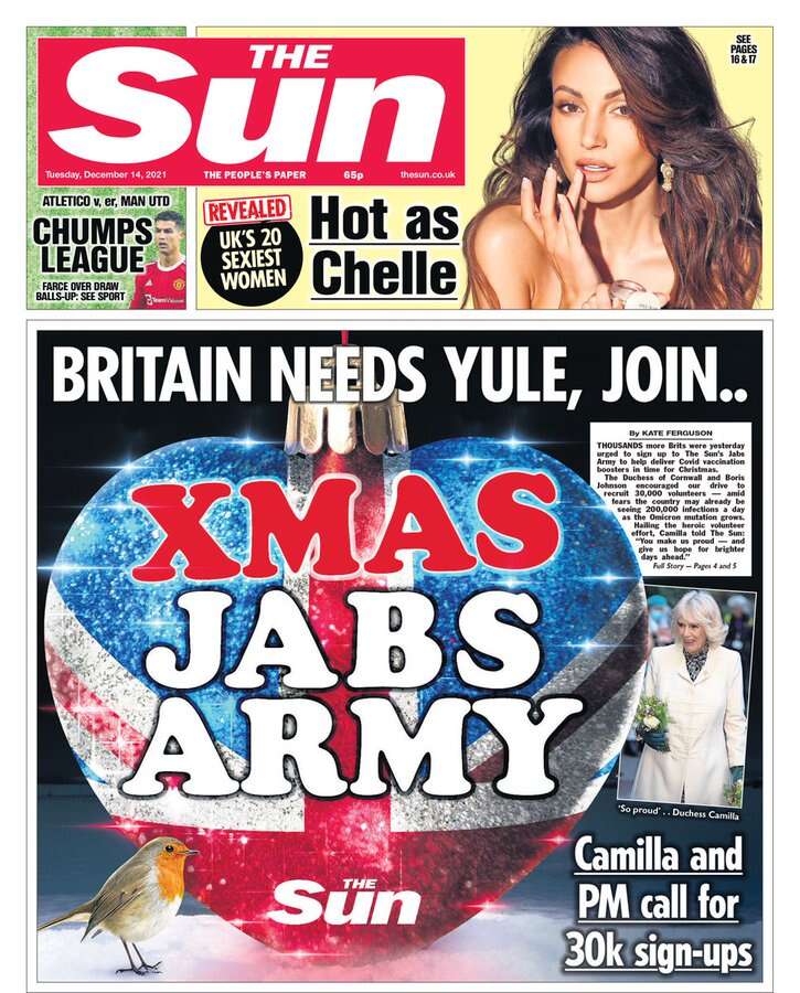 The Jabs Army campaign claims support from Camilla, Duchess of Cornwall, Manchester United captain Harry Maguire, and Piers Morgan. The Sun’s article proclaiming its success this time around quotes encouragements from figures as disparate as television presenter Vernon Kay, boxer Nicola Adams, and barrister Rob Rinder, who writes a column for the paper.