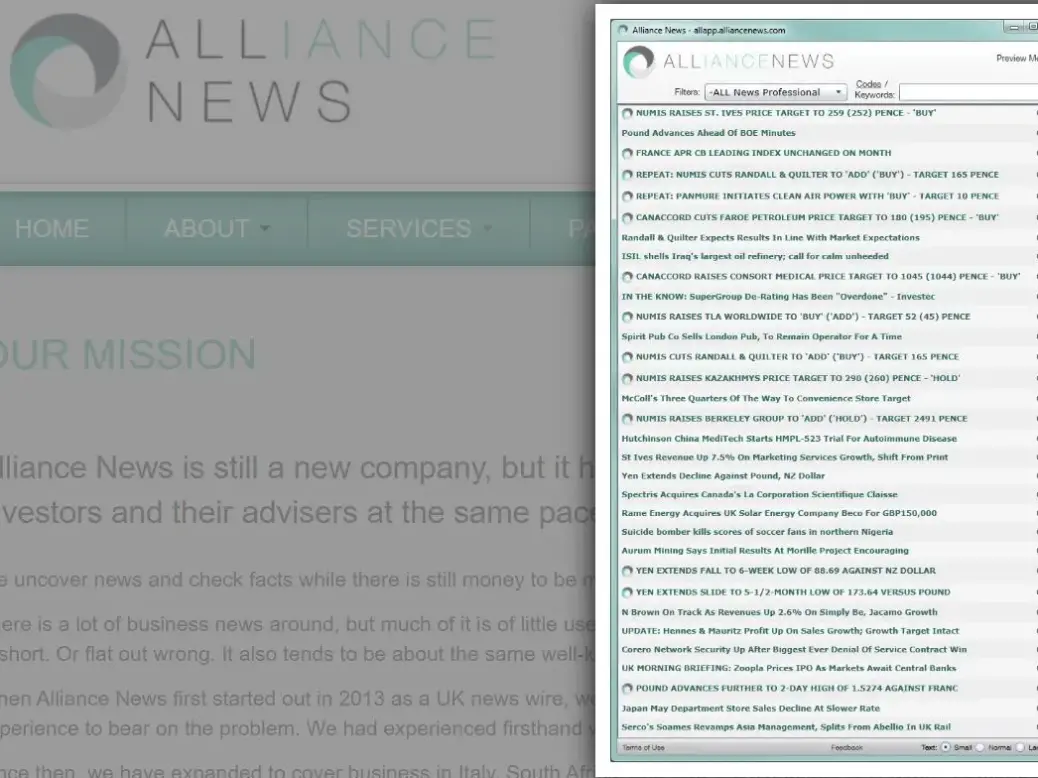 Alliance News founded a UK service providing fast updates of every London-listed company in 2013 and later expanded into Italy, South Africa and a Global 500 service.